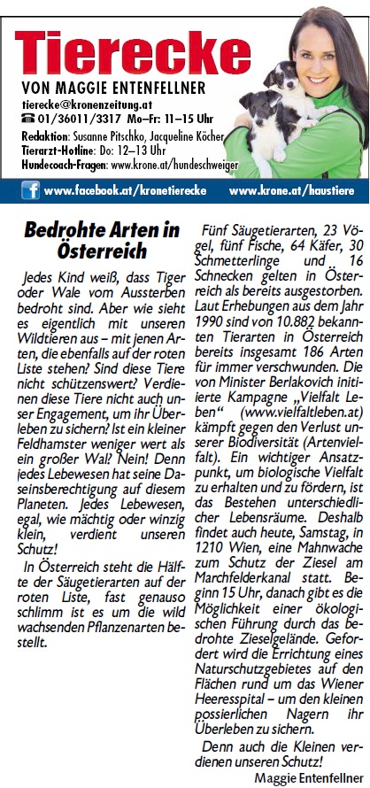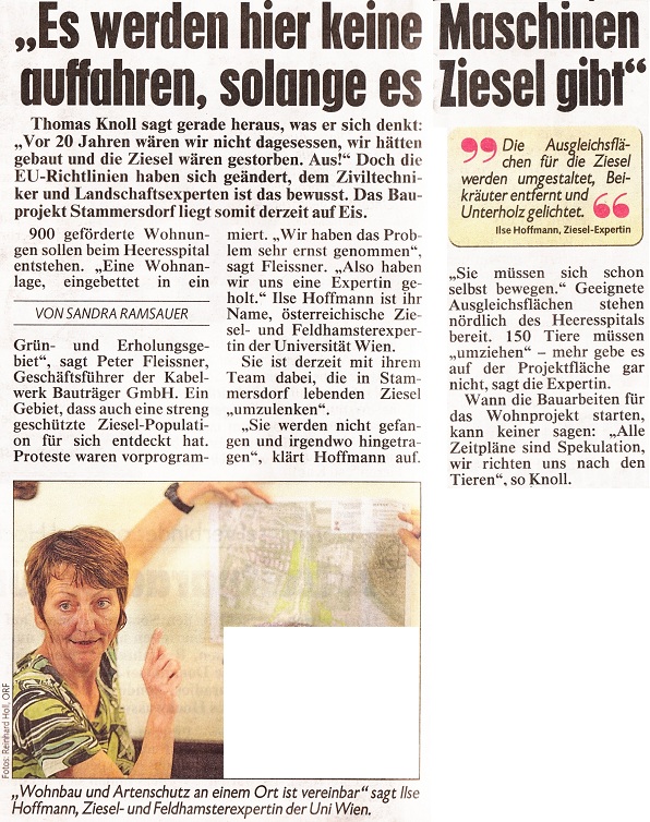 Trotz des begründeten strengen Schutzstatus der Ziesel, wurde beim Wiener Heeresspital 2010 der Lebensraum einer der letzten großen Ziesel-Kolonien kommentarlos teilweise für Wohnbau umgewidmet. Nun droht eine Absiedlung der sensiblen Tiere auf ominöse Ausgleichsflächen, deren Lage bislang – wenn überhaupt – nur die eingeschaltete PR-Agentur kennt.