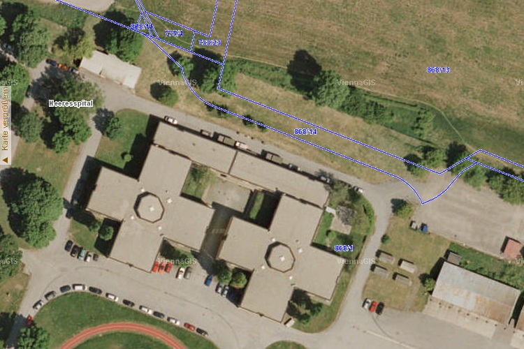 Wie oben ersichtlich, überschneiden sich die Grundstücke 868/13 und 868/14 (beide KG 01616) mit bestehenden Grünflächen am Bundesheer-Gelände. Konkret sehen sowohl die bestehende Flächenwidmung, als auch kolportierte Projektpläne, dort ein Wohngebäude und eine Zufahrtsstraße mit Wendekreis vor.
