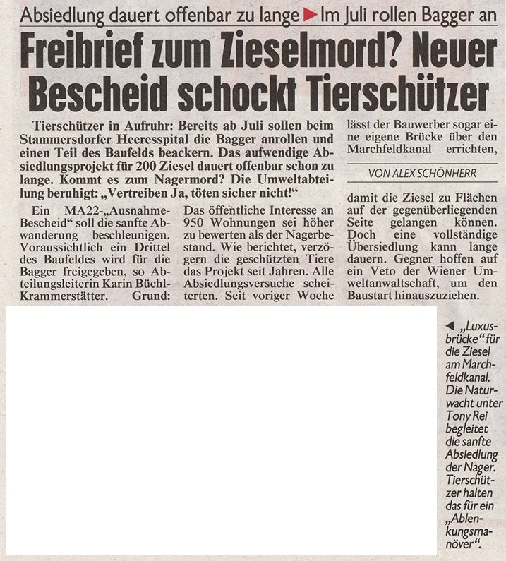 In ihrer Panik werden die zahlreich betroffenen Zieseln sicher nicht nach Brücken suchen, sondern sich in alle Richtungen zerstreuen. Wie bei Umsiedlungen mittels Käfigen, muss von massiven Verlusten unter den Tieren ausgegangen werden. Beraubt um ihre Baue, will sie die Stadt Wien erbarmungslos ihrem düsteren Schicksal überlassen.