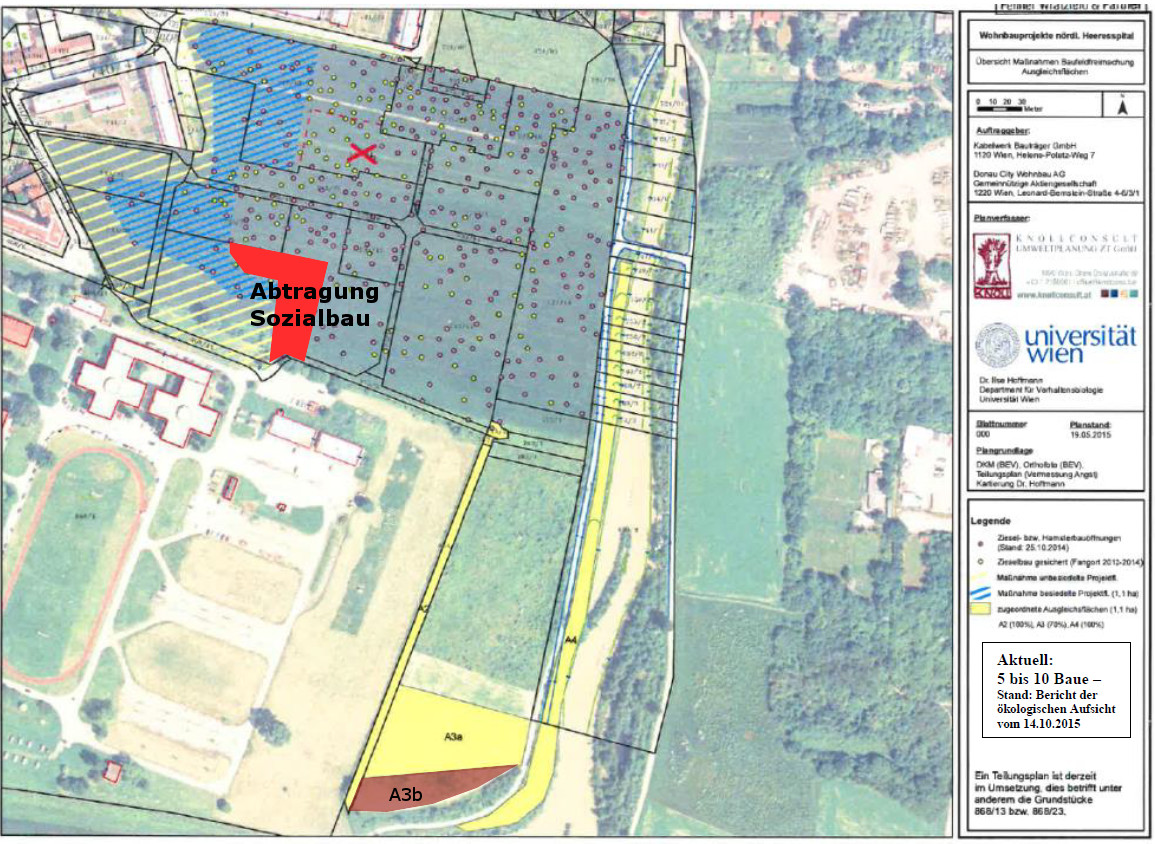 Nachdem bereits im letzten Jahr dem Bauträger „Kabelwerk“ die Zerstörung von ca. zwei Hektar nördlich vom Heeresspital genehmigt wurde – hier ist der ehemalige Ziesel-Lebensraum bereits zubetoniert – erhielt im jetzigen Anlassfall die teilweise in SPÖ-Besitz stehende „Sozialbau“ von der Wiener Umweltbehörde eine Ausnahme-Genehmigung für den Bodenabtrag von weiteren rund 0.3 Hektar. Das Besondere daran ist, dass es sich um jenen Rest-Teil des rechteckigen Sozialbau-Grundstücks handelt, auf welchen bei der letztjährigen Ausnahme-Einreichung angeblich “vergessen” (!) wurde. Betroffen ist noch dazu ein Areal, zu dem es bei der Genehmigung im Vorjahr hieß: ”Auf der Fläche nördlich des Heeresspitals gibt es noch ca. 5 ha weiteren Lebensraum, die von den gegenständlichen Maßnahmen nicht betroffen sind”[7]. Hatte man im Vorjahr noch Ersatzflächen im Ausmaß von 1:1 als Kompensation verlangt, reichen bei der Sozialbau nunmehr 0.2 ha aus, mehr war in der Umgebung des Heeresspitals nicht mehr aufzutreiben (Fläche A3b im Plan) und anscheinend ist es inzwischen auch egal geworden, ob für die unter strengstem Naturschutz stehenden Tiere in der Umgebung noch genügend Ausweichflächen vorhanden sind.