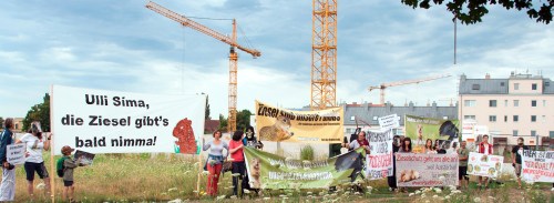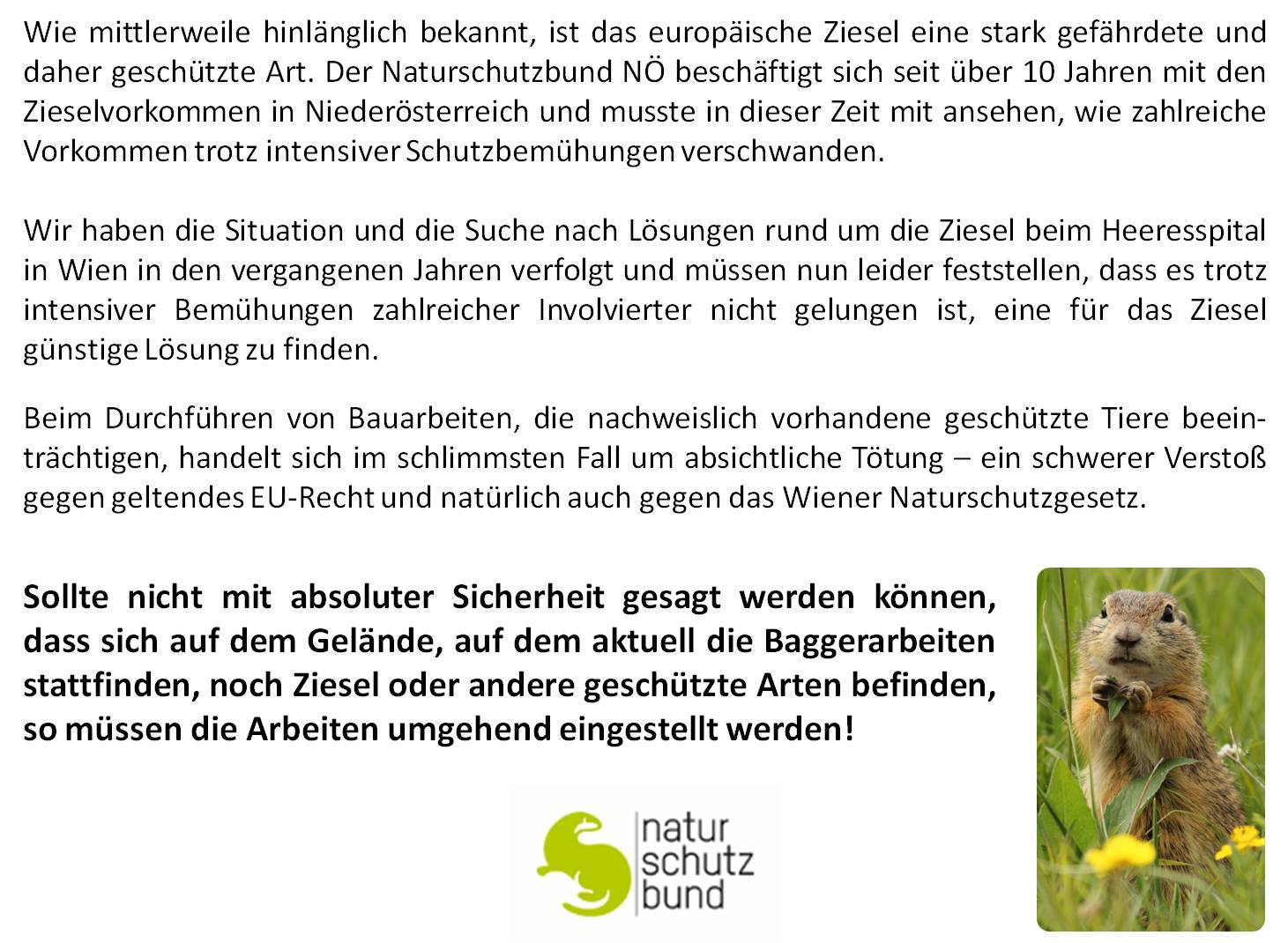 Obwohl Ziesel (Spermophilus citellus, in den meisten mitteleuropäischen Ländern bereits ausgestorben), von der Stadt Wien laut Naturschutzverordnung aber auch auf internationaler Ebene strengster Schutzstatus zugestanden wird und sie laut EU FFH-Richtlinie weder gestört, vertrieben, verletzt oder gar getötet werden dürfen, fahren jetzt in Wien wieder einmal die Bagger auf. Der geschützte Ziesel-Lebensraum fällt Stück für Stück diversen Bauprojekten am Wiener Stadtrand zum Opfer – mit behördlicher Hilfestellung.