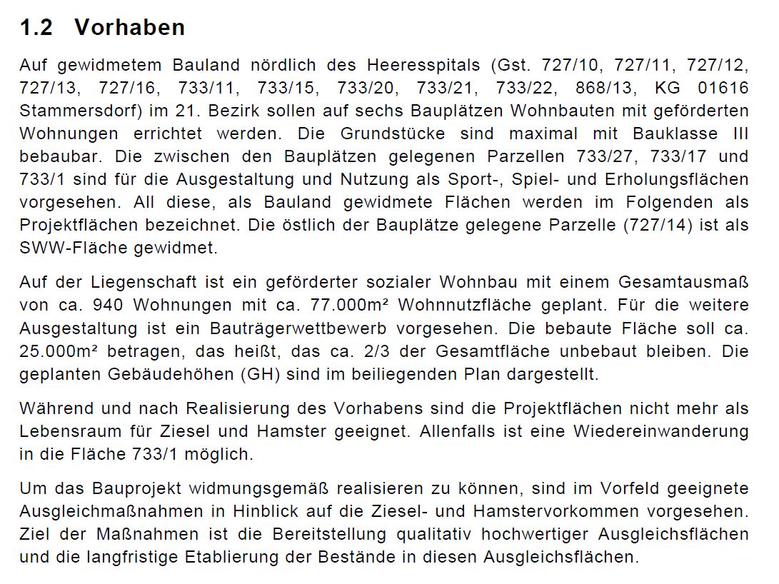 Erst durch die Stellungnahme der MA 18 (Stadtentwicklung und Stadtplanung), die das überwiegende öffentliche Interesse am Wohnbau an diesem Standort bescheinigt, wurde die Ausnahme vom Artenschutz zur Genehmigung der Zieselvertreibung möglich gemacht. Die Argumentation, wieso ausgerechnet der Lebensraum einer vom Aussterben bedrohten Art ein alternativloser Standort für ein Bauprojekt sein soll, wie sie in Wien jährlich zu dutzenden verwirklicht werden, gibt einen tiefen Einblick, wieso es um die Biodiversität in Österreich und vor allem in Wien so schlecht bestellt ist: