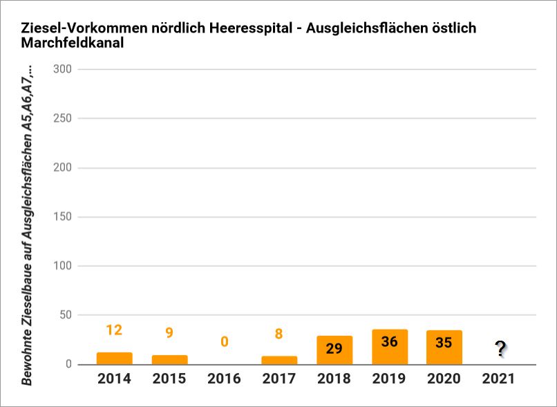 Hinzu kommt, dass diese Ausgleichsfläche nur über einen eigens errichteten “Zieselsteg” [6] mit dem restlichen Vorkommen beim Heeresspital verbunden ist. Ist das Bauprojekt dann im Vollausbau genehmigt und vollendet, ist der schmale Grasstreifen zwischen Brücke und bebautem Gebiet mit Sicherheit nicht mehr für Ziesel geeignet, und das Vorkommen auf der Ausgleichsfläche (sofern es dann noch eines gibt) vom Rest des Heeresspitalsvorkommens abgeschnitten. Bereits jetzt wächst der Bestand auf dieser Ausgleichsfläche seit drei Jahren nicht mehr, trotz immensem Auswanderungsdruck durch die Verkleinerung des Lebensraums auf der Zieselwiese.