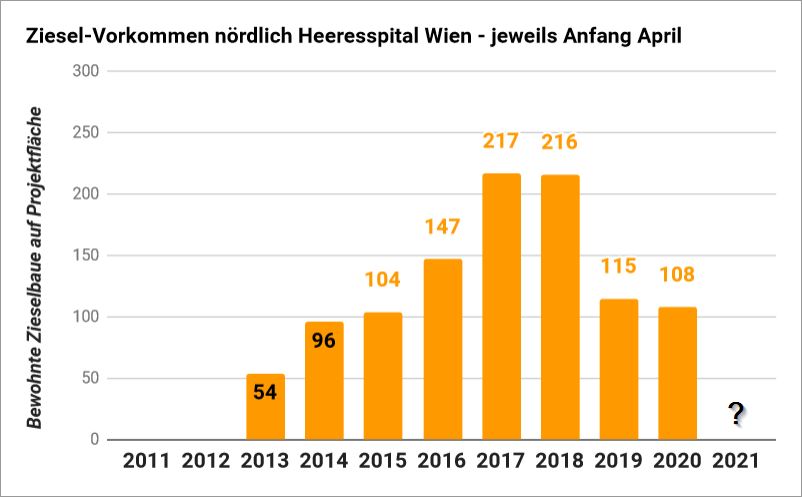Nach einem Kippen der Population sieht es zur Zeit nämlich aus. Auf dem noch unverbauten Teil der Zieselwiese herrscht gespenstische Stille, die sonst bei dichten Zieselvorkommen üblichen Warnrufe sind kaum zu vernehmen. Selbst in der Paarungszeit, in der die Tiere stark an der Oberfläche aktiv sind waren kaum Ziesel zu bemerken. Die Monitoringberichte, die seit 2013 vierteljährlich zum Zustand des Vorkommens vorliegen, verraten dazu: nichts. Der letzte Bescheid der MA 22, der das Monitoring regelte, lief Ende 2020 aus und ein Nachfolgebescheid wurde erst gar nicht ausgestellt. Wie es also um das Vorkommen in der aktuellen Saison, kurz vor weiteren drohenden Lebensraumeingriffen steht, ist somit nicht offiziell bekannt. “Was die MA 22 nicht weiß – oder wissen will -, macht die MA 22 nun mal nicht heiß” und so genehmigt sie munter die weitere Vernichtung von Grünflächen bzw. Lebensraum der streng geschützten Ziesel. In dieses Bild passt auch, dass die letzte Zustandserhebung im Kerngebiet des Vorkommens, auf dem Gelände des Heeresspitals, vor 10 Jahren stattgefunden hat, obwohl laut dem Wiener Zieselaktionsplan [5] alle Vorkommen im 6-Jahres Rhythmus erfasst werden sollen (und bis auf das Heeresspital auch werden). Fehlt der Vergleich mit der Entwicklung desselben Vorkommens im Heeresspital, kann man einen Einbruch der Population auf der Projektfläche bequem auf mutmaßliche “natürliche Schwankungen” des gesamten Vorkommens schieben.