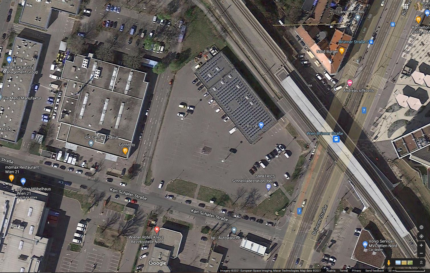 Würde es die Stadt mit dem Fokussieren der Entwicklung auf infrastrukturell gut erschlossene, innerhalb des bereits Bebauten liegende Gebiete ernst meinen, müsste sie sich beispielsweise das Umfeld der Schnellbahnstation Brünnerstrasse vornehmen – mit einem verloren auf einem weitläufigen Parkplatz freistehenden Billa, direkt beim Abgang der Station. Besser erschlossene und gleichzeitig weniger effizient genutzte Flächen, wird man kaum finden.