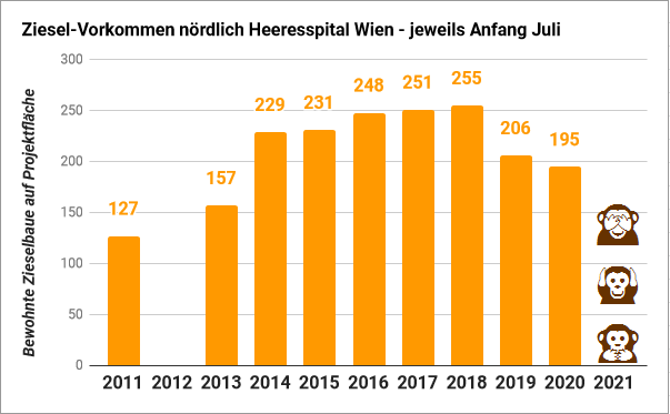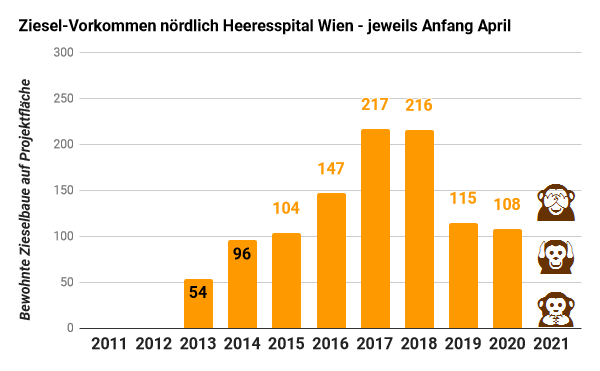 Für regelmäßige Besucher des Zieselfelds nördlich vom Heeresspital war heuer ein auffälliger Rückgang der Zieselaktivität auf der noch unverbauten Projektfläche und den Ausgleichsflächen östlich des Marchfeldkanals nicht zu übersehen. Nur die Umweltbehörde MA 22 will davon mit aller Kraft nichts wissen, und lässt das Monitoring des Vorkommens für ein halbes Jahr ausfallen.