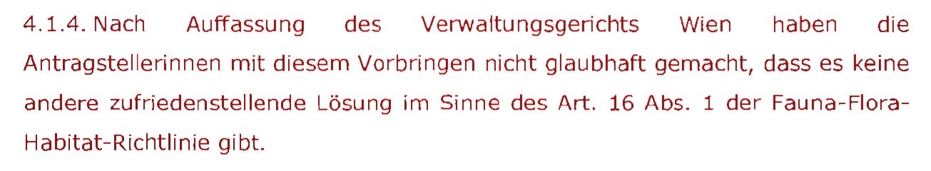 Ausschlaggebend für die Aufhebung des naturschutzrechtlichen Bescheids der MA 22 war die unzureichende Prüfung möglicher Alternativen. Die Projektbetreiber konnten nicht schlüssig belegen, dass es zur Verwirklichung des Bauprojekts auf besagter Fläche keine gleichwertigen Alternativen mit geringeren Auswirkungen auf streng geschützte Arten existieren, um in Wien ausreichend leistbaren Wohnraum zu schaffen.