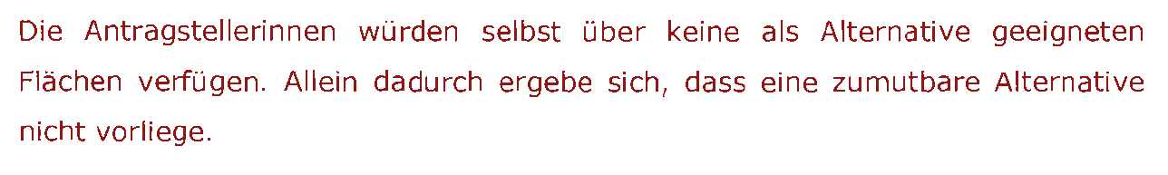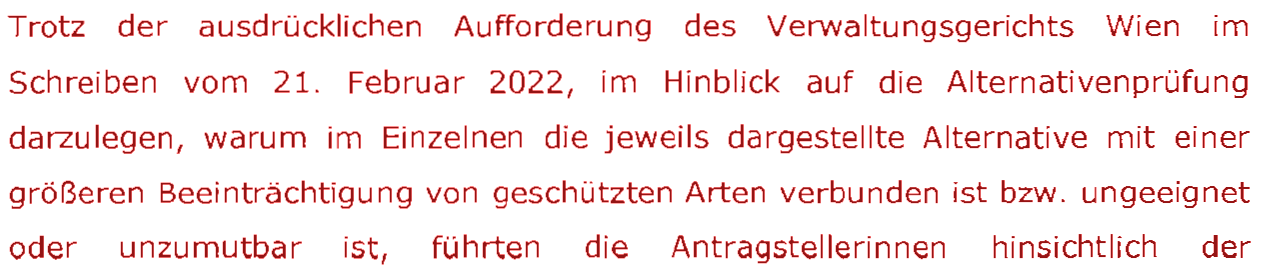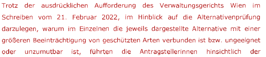 Die Projekteinreichung enthielt statt einer Alternativenprüfung lediglich ein lapidar mit „Keine andere zufriedenstellende Lösung“ betiteltes Kapitel. Doch selbst nachdem die Bauträger vom Gericht zu einer Mangelbehebung aufgefordert wurden, waren diese nicht in der Lage, eine gesetzeskonforme Alternativenprüfung vorzunehmen. Der im Zuge des Verfahrens nachgereichte, an eine Alternativenprüfung angelehnte, Schriftsatz konnte nicht darlegen, weshalb just die von Zieseln besiedelte Fläche alternativlos zur Schaffung „leistbaren Wohnens“ in Wien sei. Ebenso gelang es nicht dazulegen, warum der dort angerichtete Schaden an Naturschutzgütern geringer wäre, als bei Realisierung des Projekts an anderer Stelle.