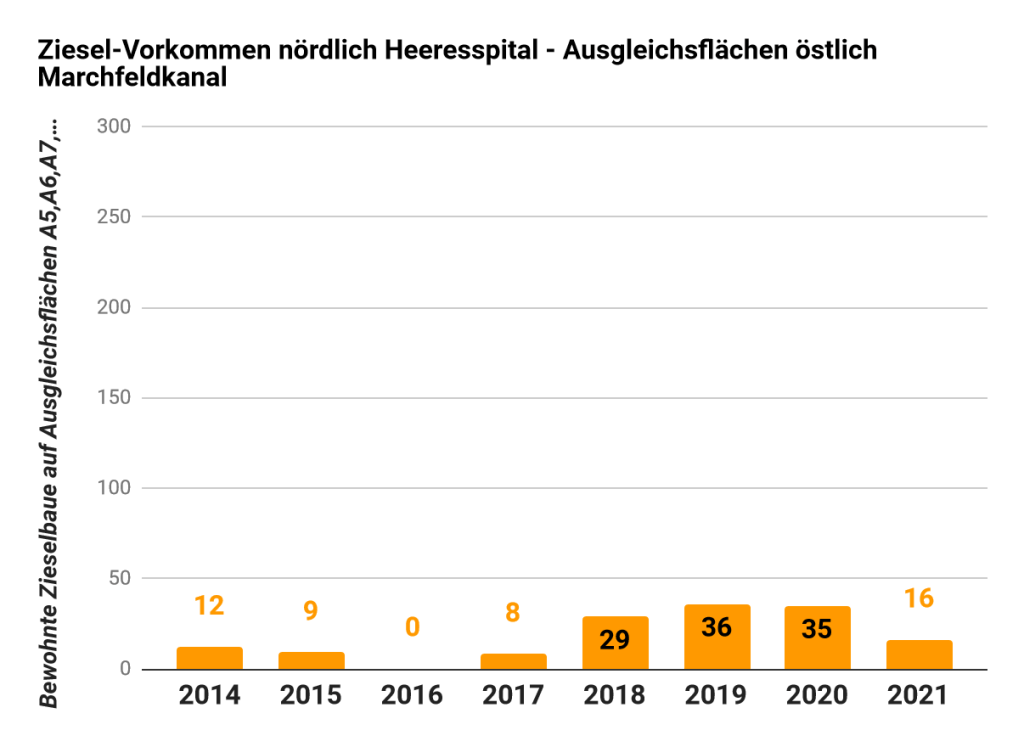 Den Zieseln auf den Ausgleichsflächen jenseits des Marchfeldkanals, für die 2015 extra eine Zieselbrücke gebaut wurde [7], ging es nicht viel besser. Der ohnehin stark schwankende Bestand halbierte sich innerhalb nur eines Jahres und führte Behauptungen, die Flächen würden von den Zieseln gut angenommen, ad Absurdum.