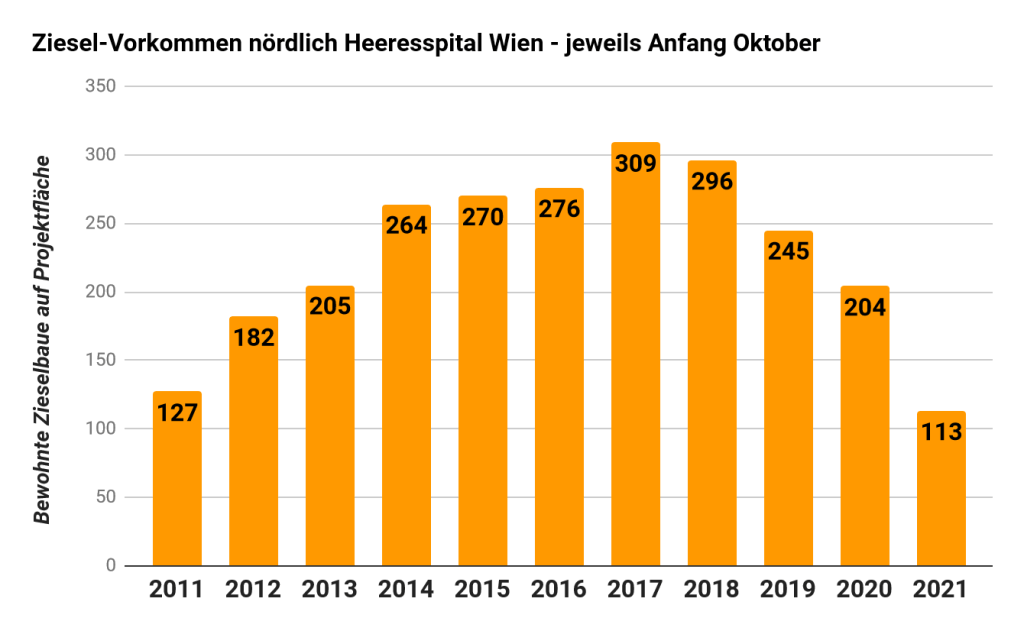 Die katastrophale Entwicklung des Vorkommens nach Anwendung der von der MA 22 in der Vergangenheit abgenickten „Ausgleichsmaßnahmen“ legt nahe, dass die Auswirkungen der bereits fertiggestellten Bauteile viel gravierender sind als von der Behörde antizipiert und die dafür als Ausgleich gedachten Flächen großteils nicht geeignet sind, um die kurzfristige und langfristige Auswirkungen des Bauprojekts zu kompensieren. Weitere Bautätigkeit würde mit ziemlicher Sicherheit das Ende für das Zieselvorkommen nördlich des Heeresspitals bedeuten.