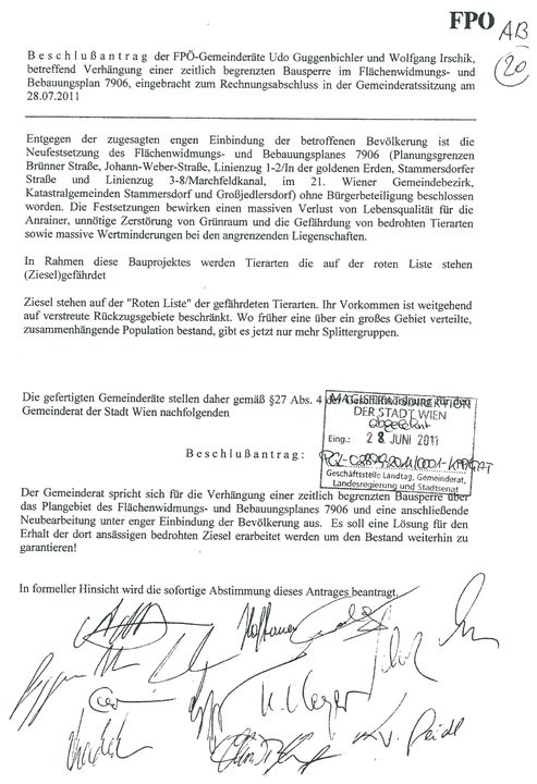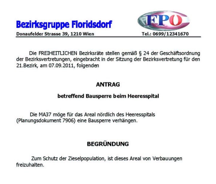 GRÜNE – 7.9.2011 Antrag zum Ziesel-Gutachten im Floridsdorfer Bezirksrat