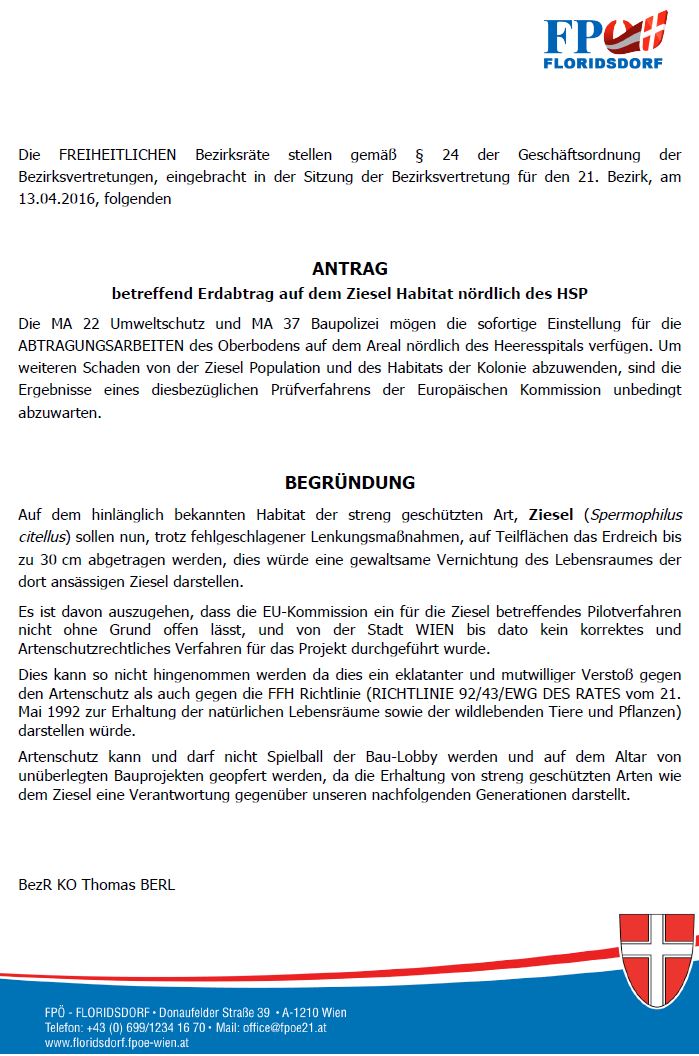 FPÖ – 22.2.2012 Ziesel-Antrag in der Floridsdofer Bezirksratsitzung und Beantwortung