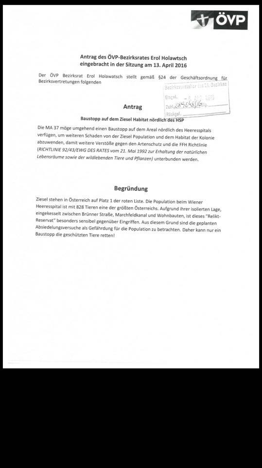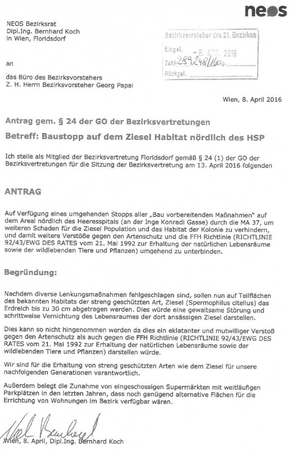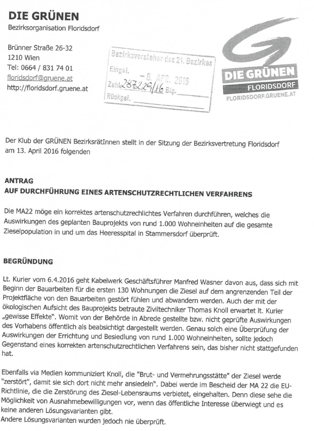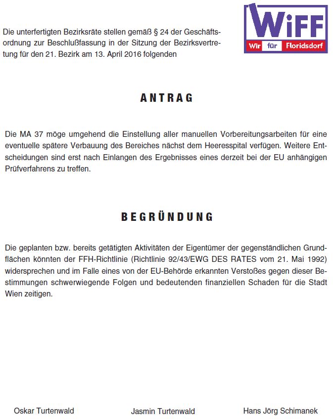Grüne 13.3.2016 Floridsdorfer Bezirksrat: Antrag auf durchführung eines artenschutzrechtlichen Verfahrens