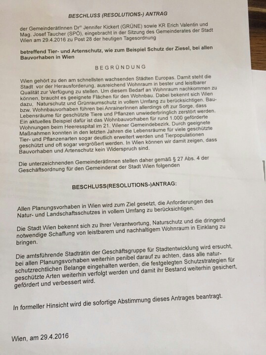 Grüne 04.2016: Wiener Gemeinderat: Resolutionsantrag zur vollen Berücksichtigung des NAturschutzes bei Planungsvorhaben